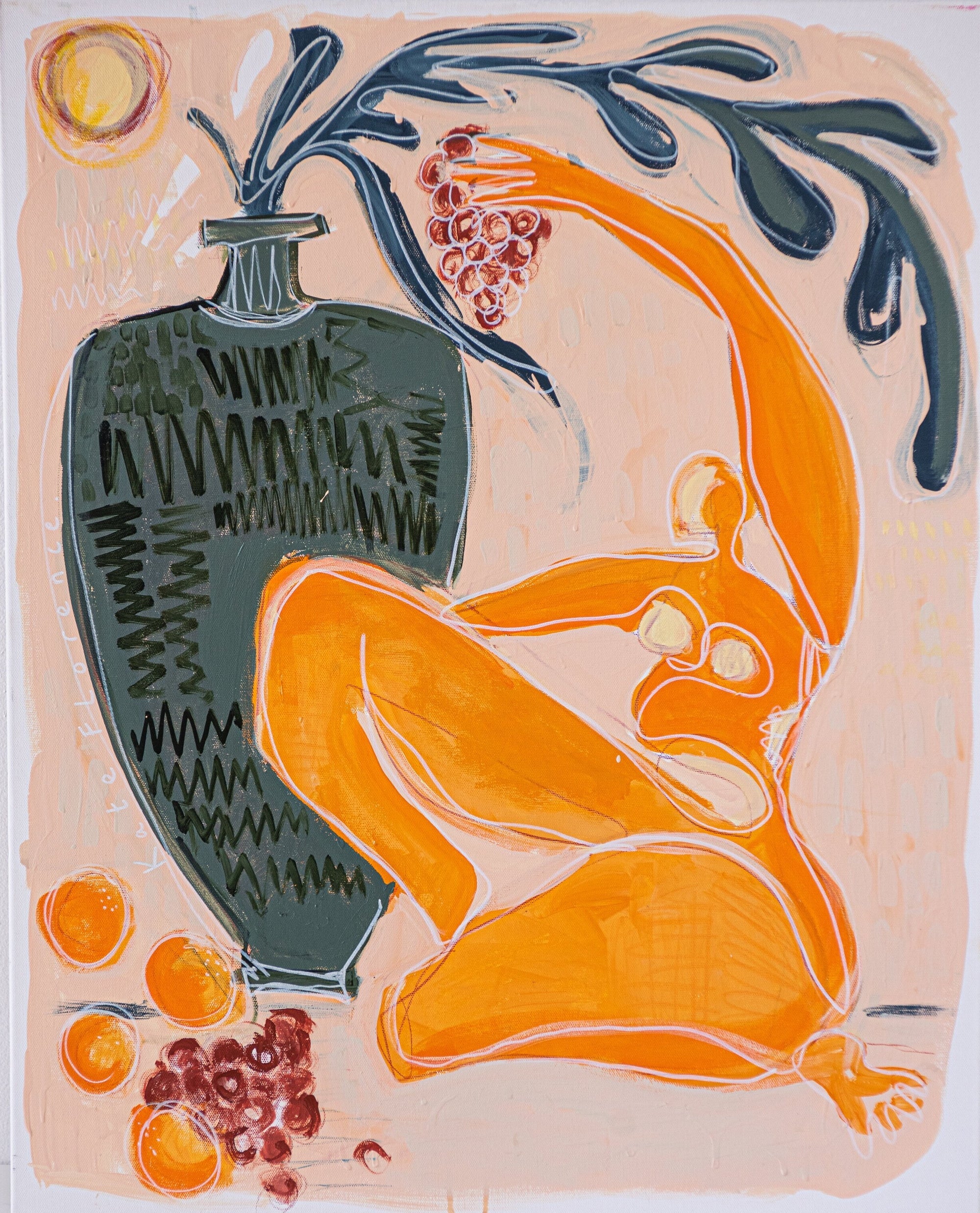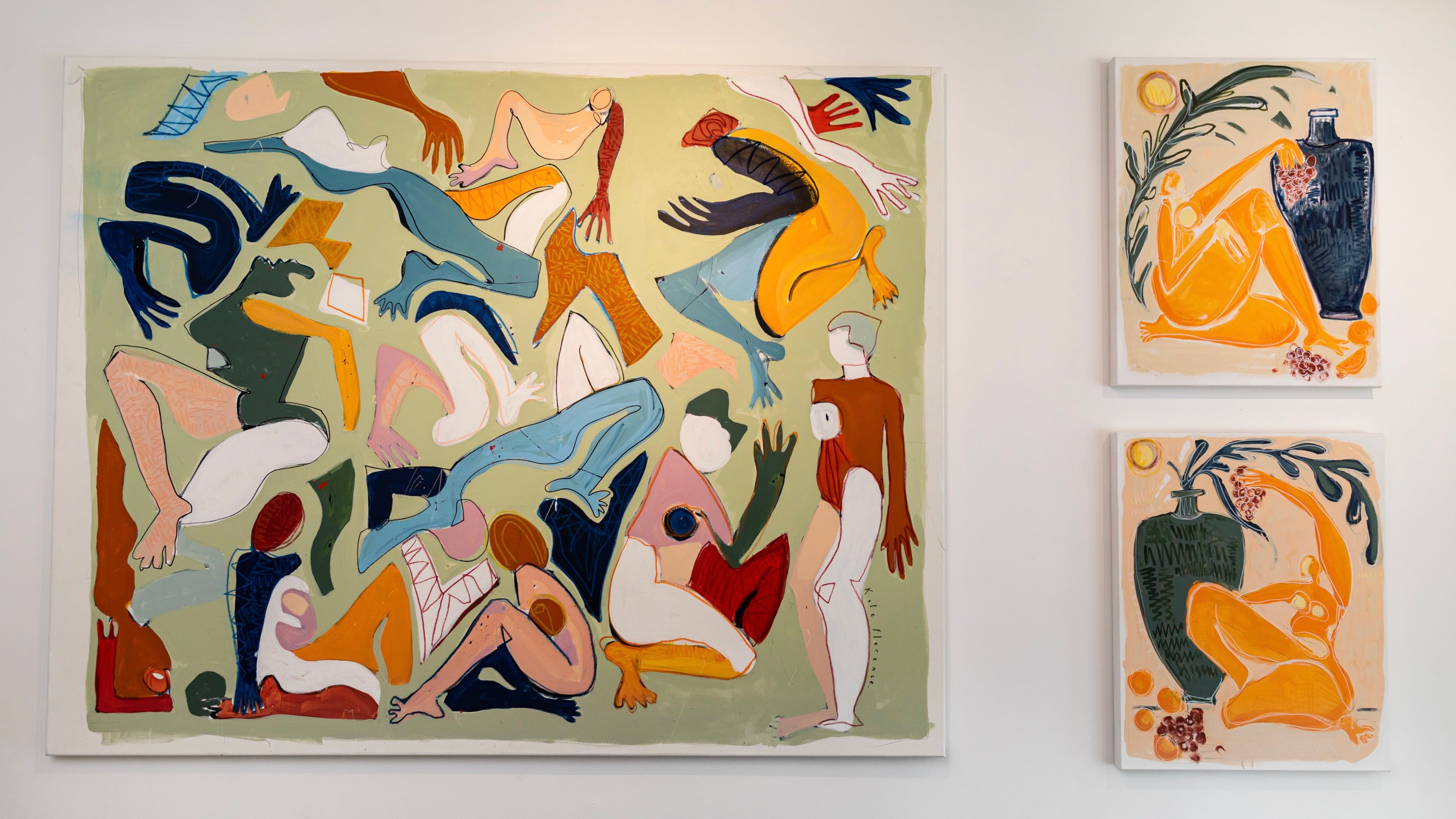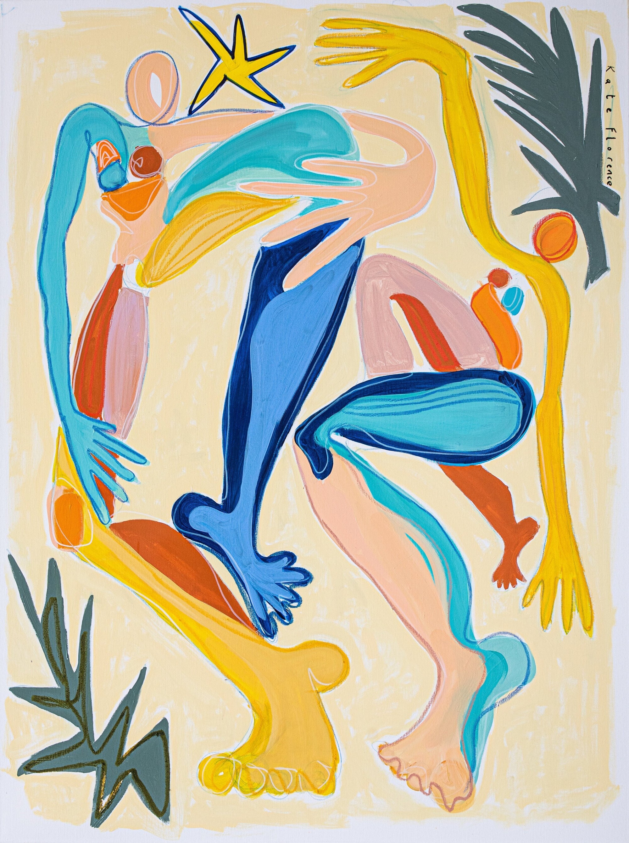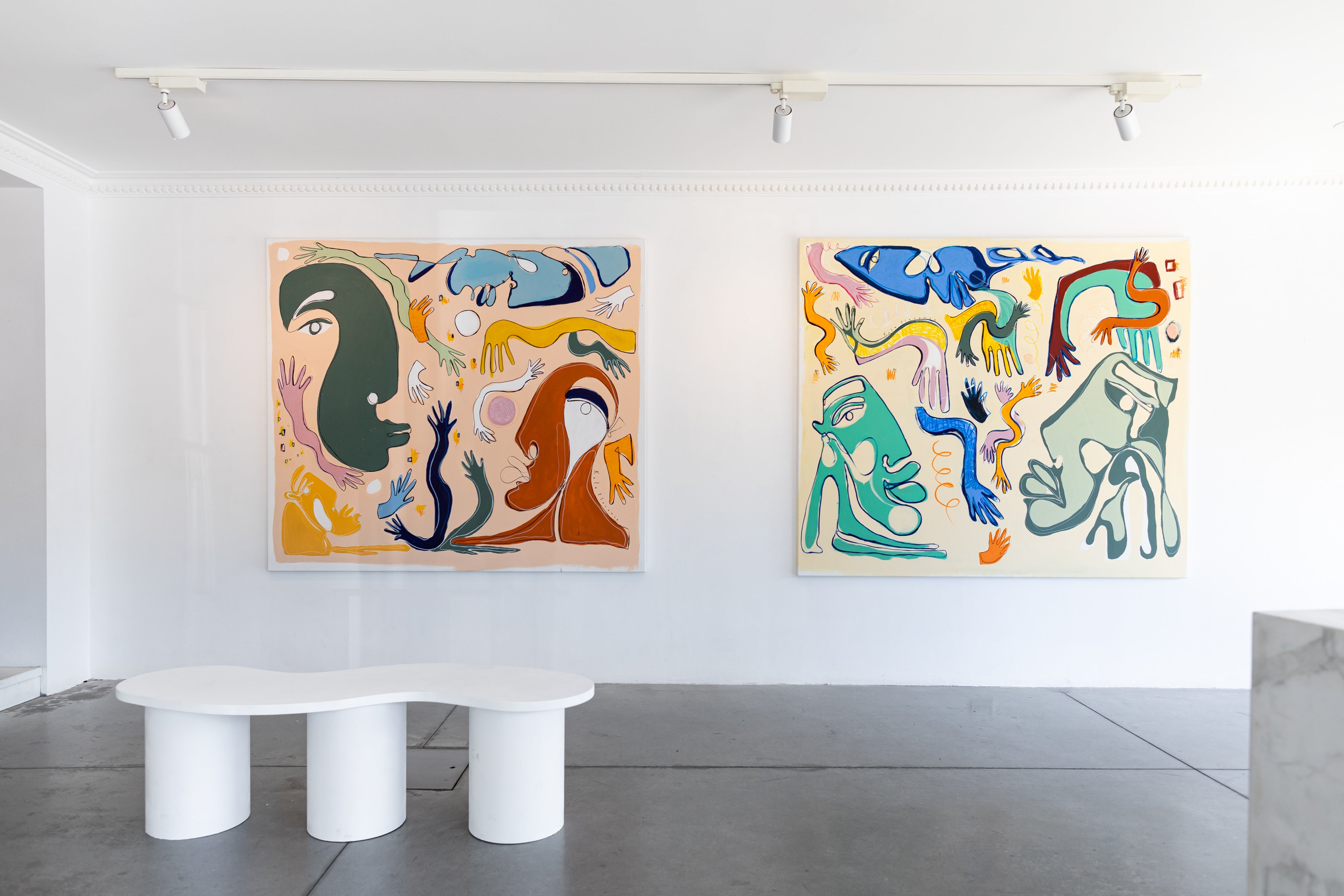 The paintings in the exhibition are a lively exploration reminiscent of post modern expressionism and Matissian composition. Stills that are encompassing layers of form, snippets of a story, with no beginning and no end; moments of play and energy, joy and tenderness.