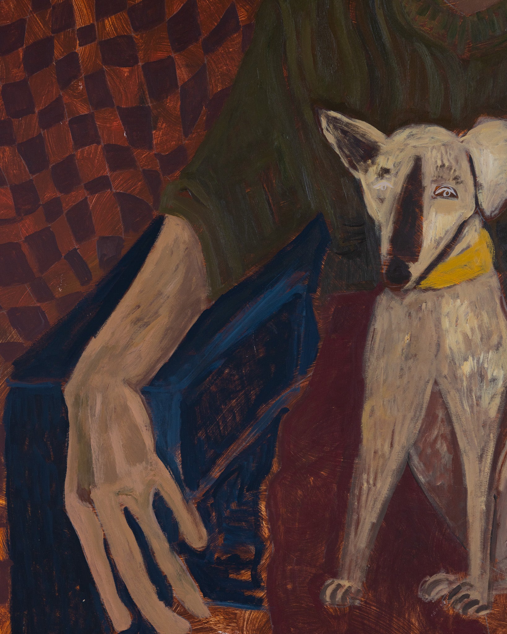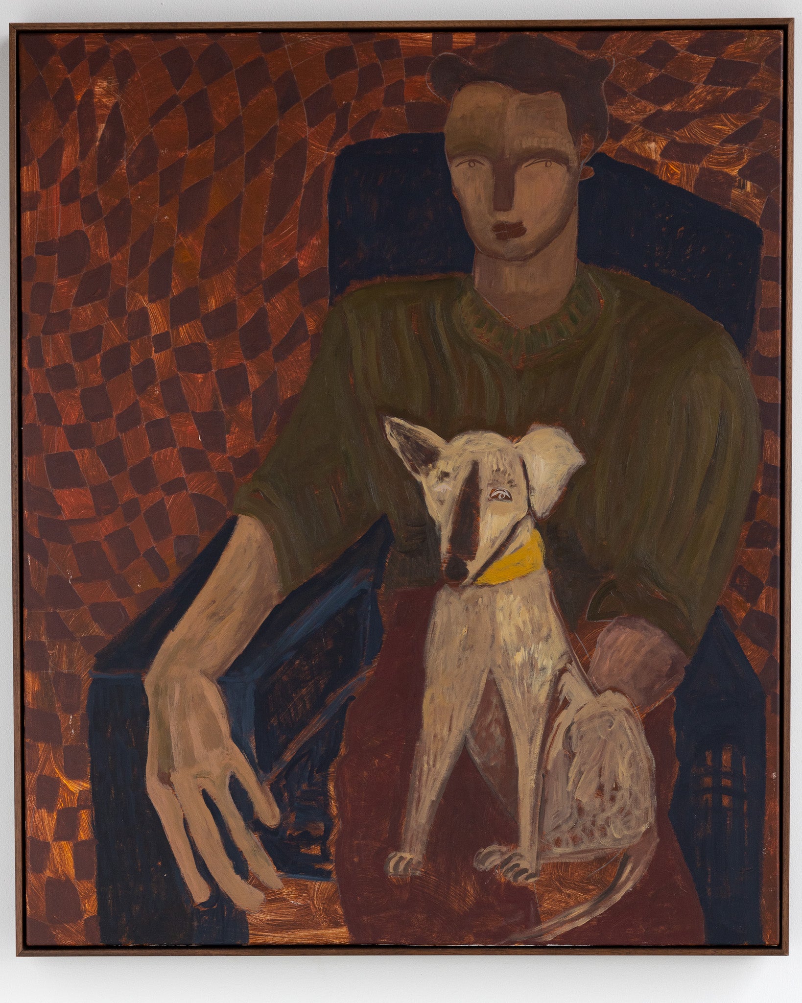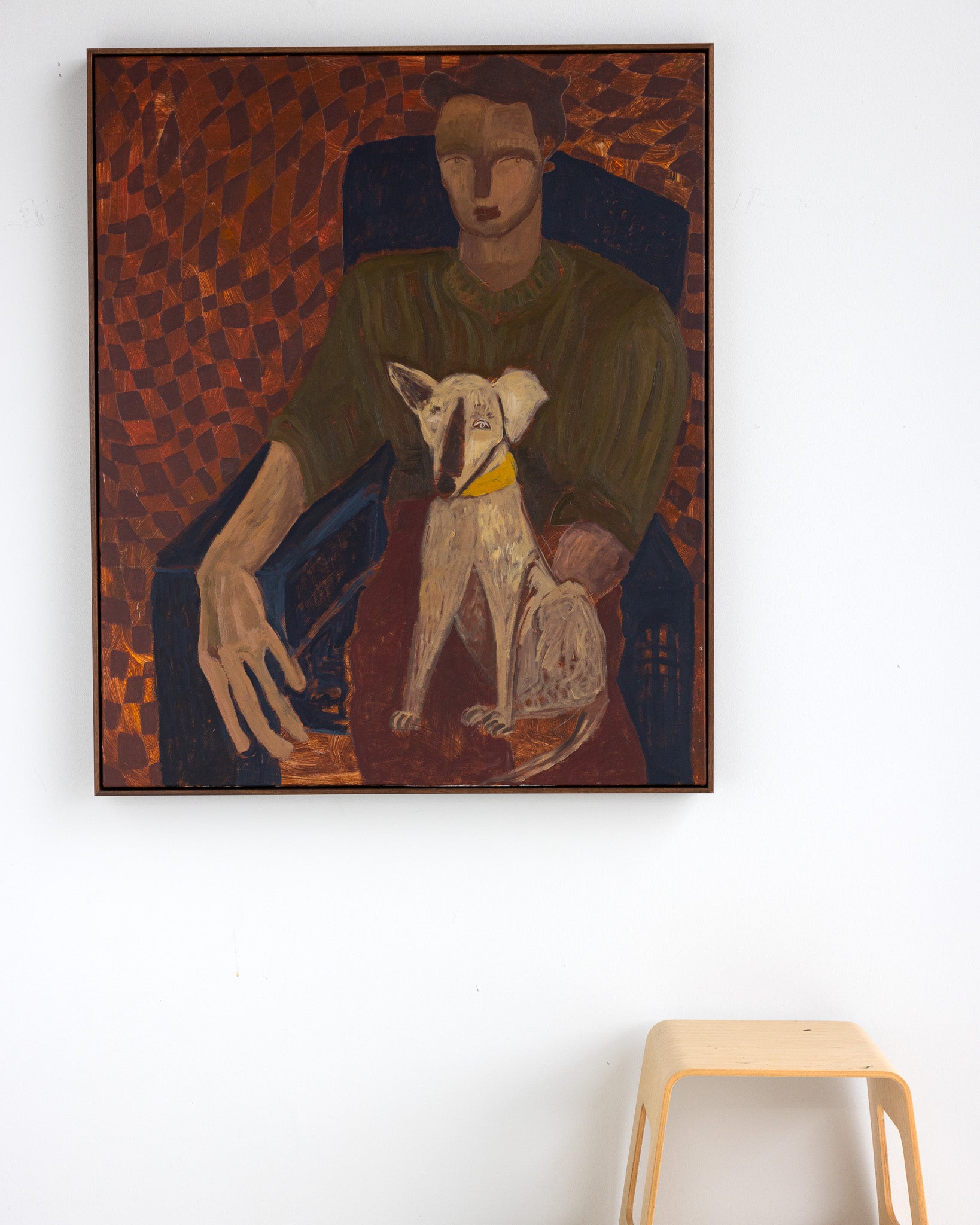 As the world hums beyond, time stands still in this moment, where only the quiet bond between man and dog remains. His hand rests gently, while his faithful companion sits, ears tuned to the silence. The checkered backdrop sways softly, mirroring their stillness.