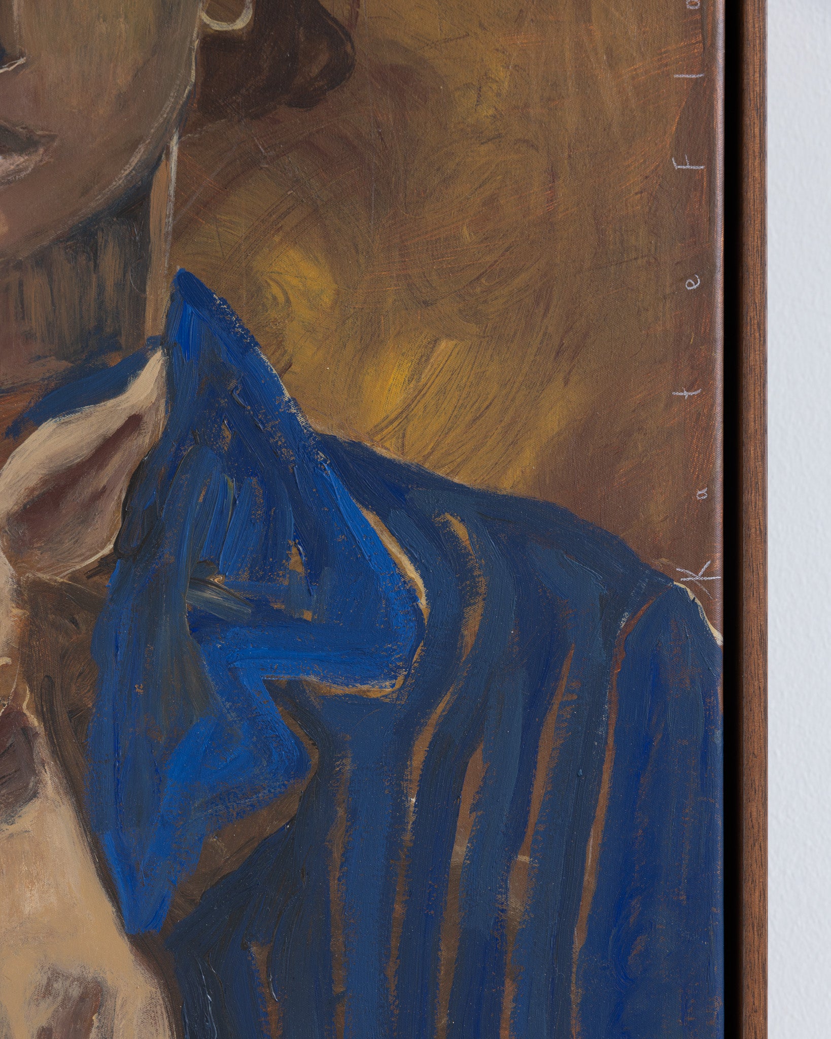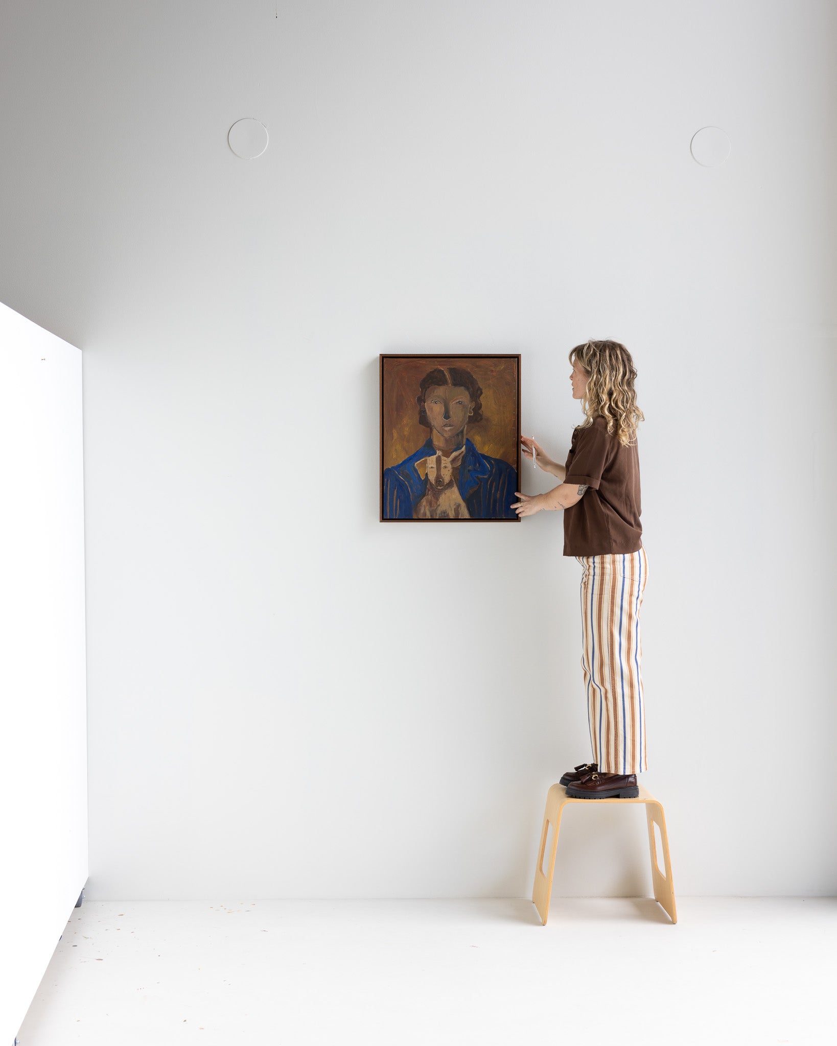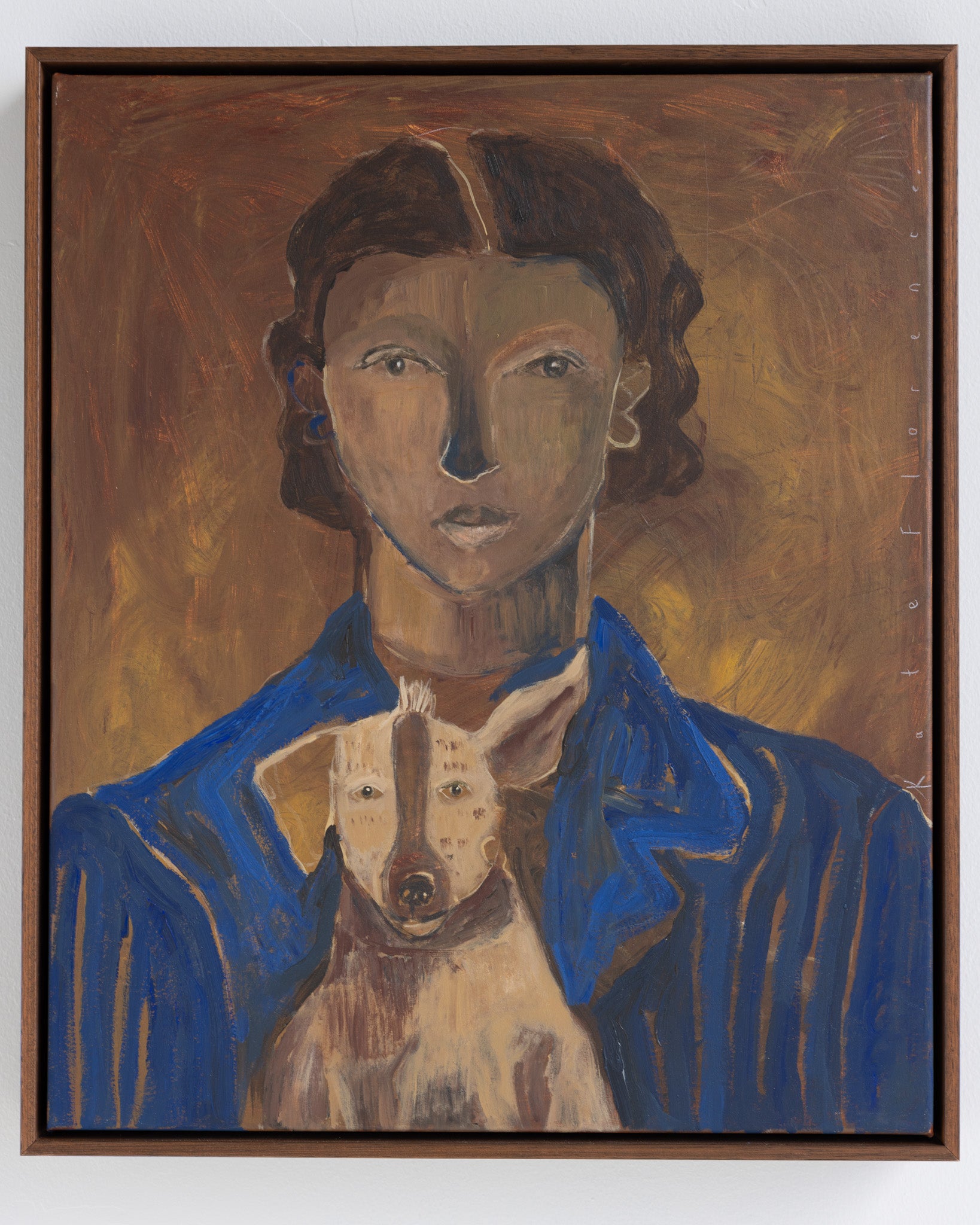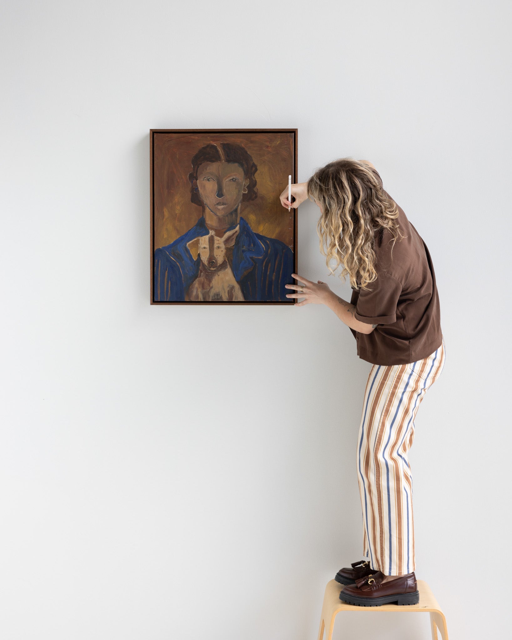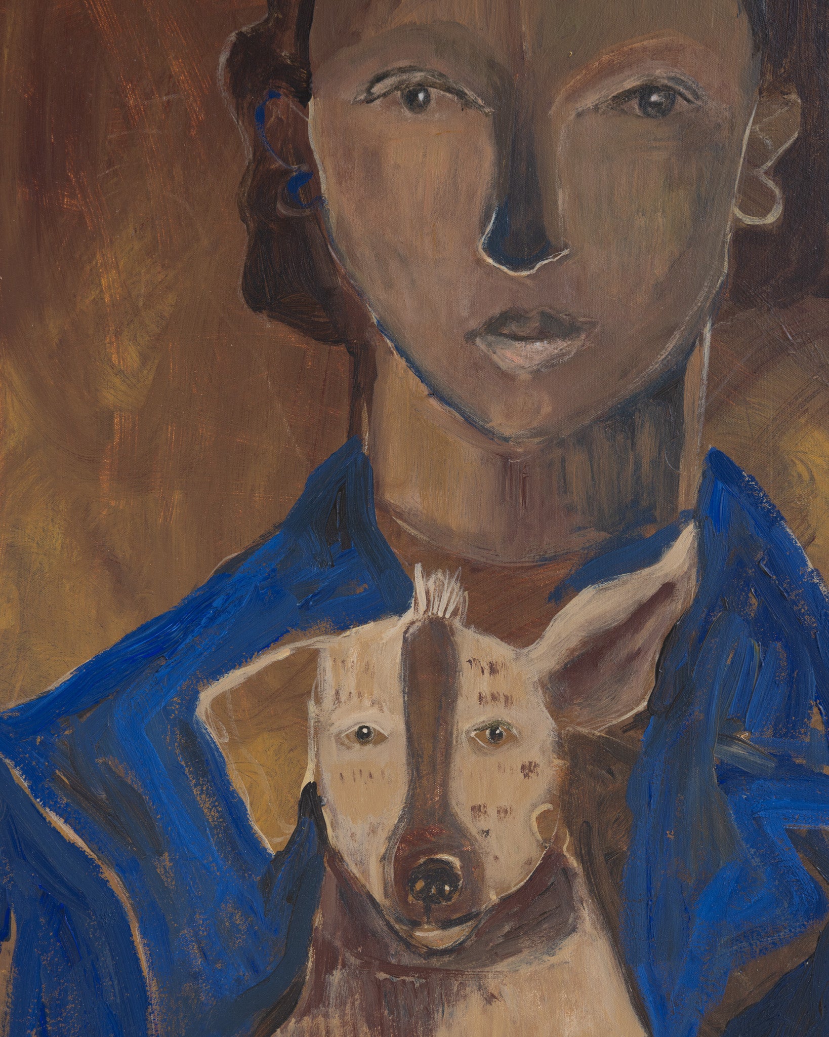 The moody palette of this piece is broken up by directing viewers attention to the subjects playful puppy centre frame. This painting speaks to the way we find ourselves in our four-legged friends, how they become extensions of us—our confidants, our shadows, our most loyal reflections.